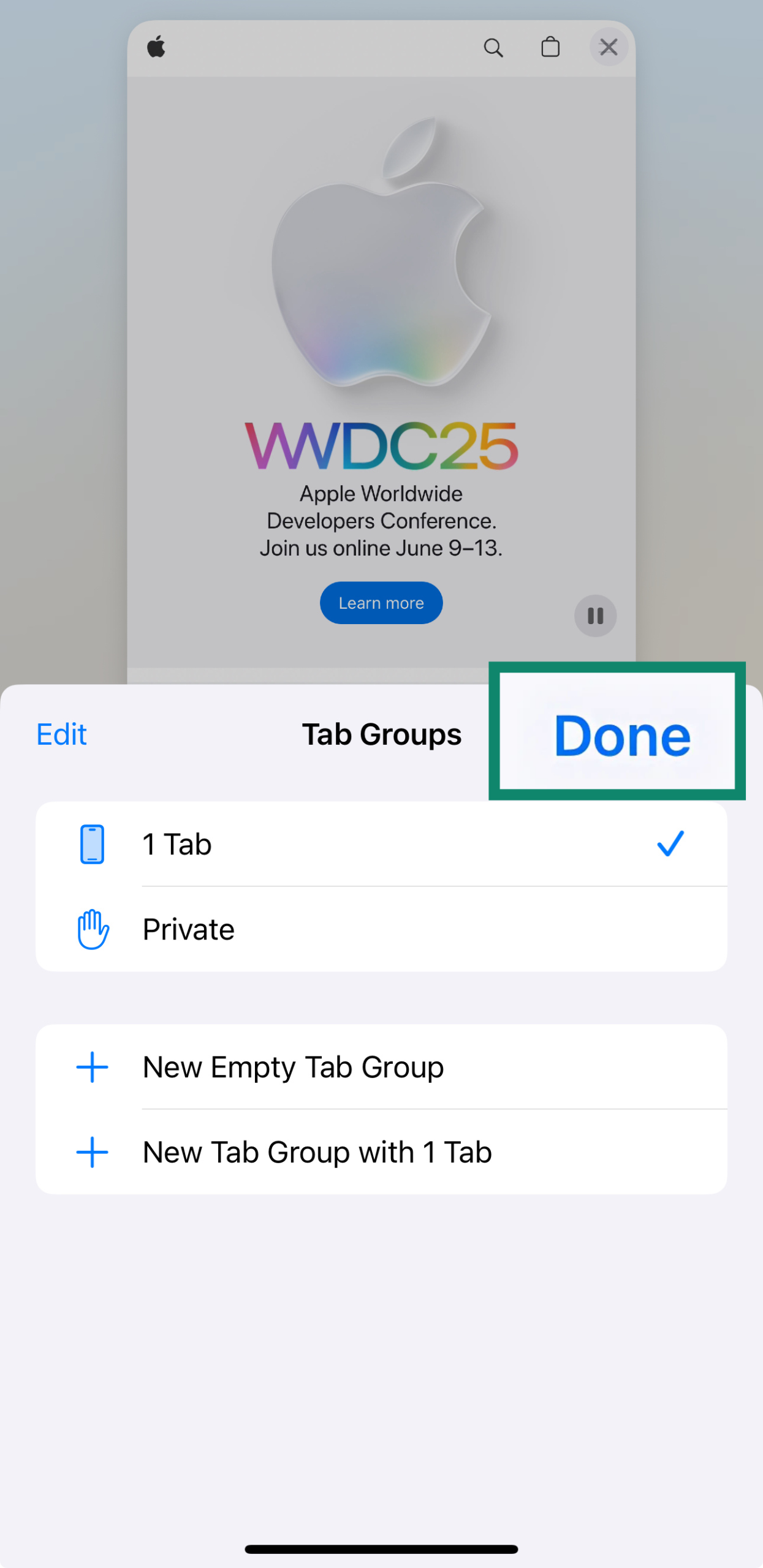 Safari Tab Groups highlighting the 1 Tab option.