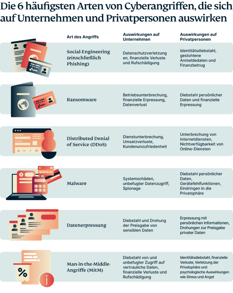Zu den häufigsten Arten von Cyberangriffen gehören die folgenden: