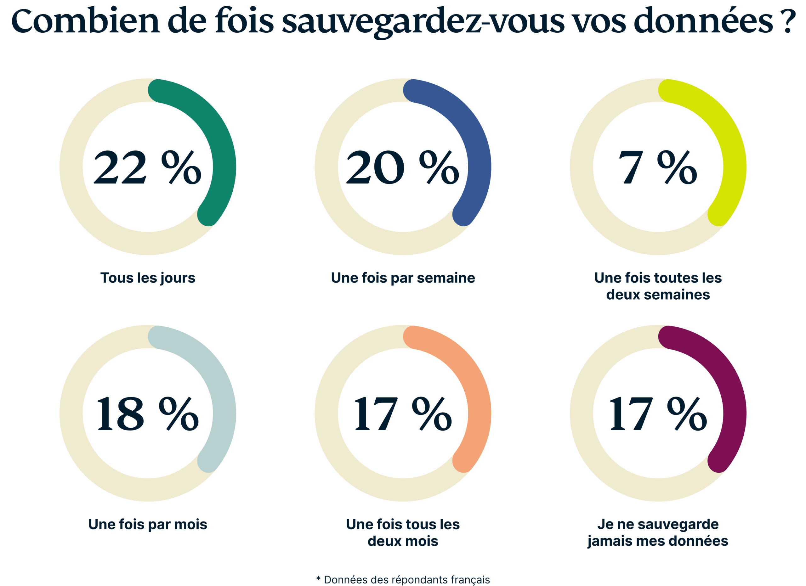 Plus de 40 % des Français sondés effectue une sauvegarde selon la fréquence recommandée, 20 % effectuant des sauvegardes hebdomadaires et 22 % étant suffisamment vigilants et attentifs pour sauvegarder quotidiennement leurs données.