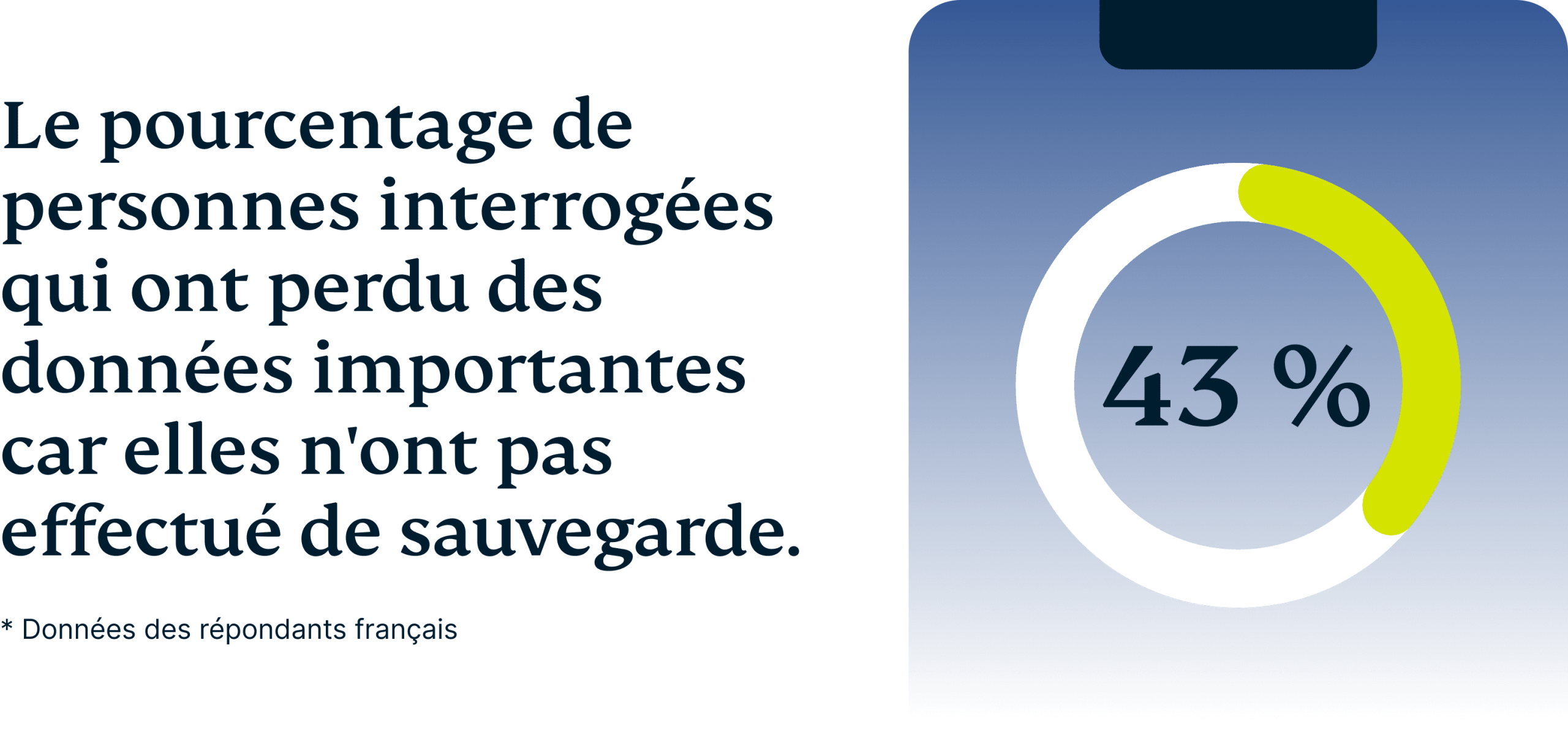 Malgré ces nombreux avantages, l'importance d'effectuer des sauvegardes régulières est souvent négligée jusqu'à ce qu'une perte de données importantes survienne. 43 % des personnes interrogées en France ont révélé avoir perdu des données importantes parce qu'elles ne les avaient pas sauvegardées.