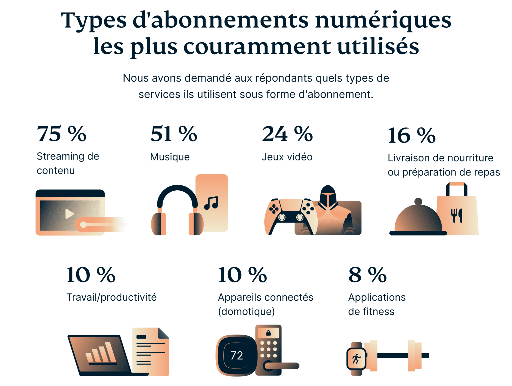 Avec autant de services d'abonnement qui réclament notre attention (et notre argent), il vaut la peine de regarder de plus près où les gens dépensent réellement. Dans notre sondage, nous avons demandé aux participants de partager les types d'abonnements numériques qu'ils utilisent le plus souvent, qu'ils les paient ou non.