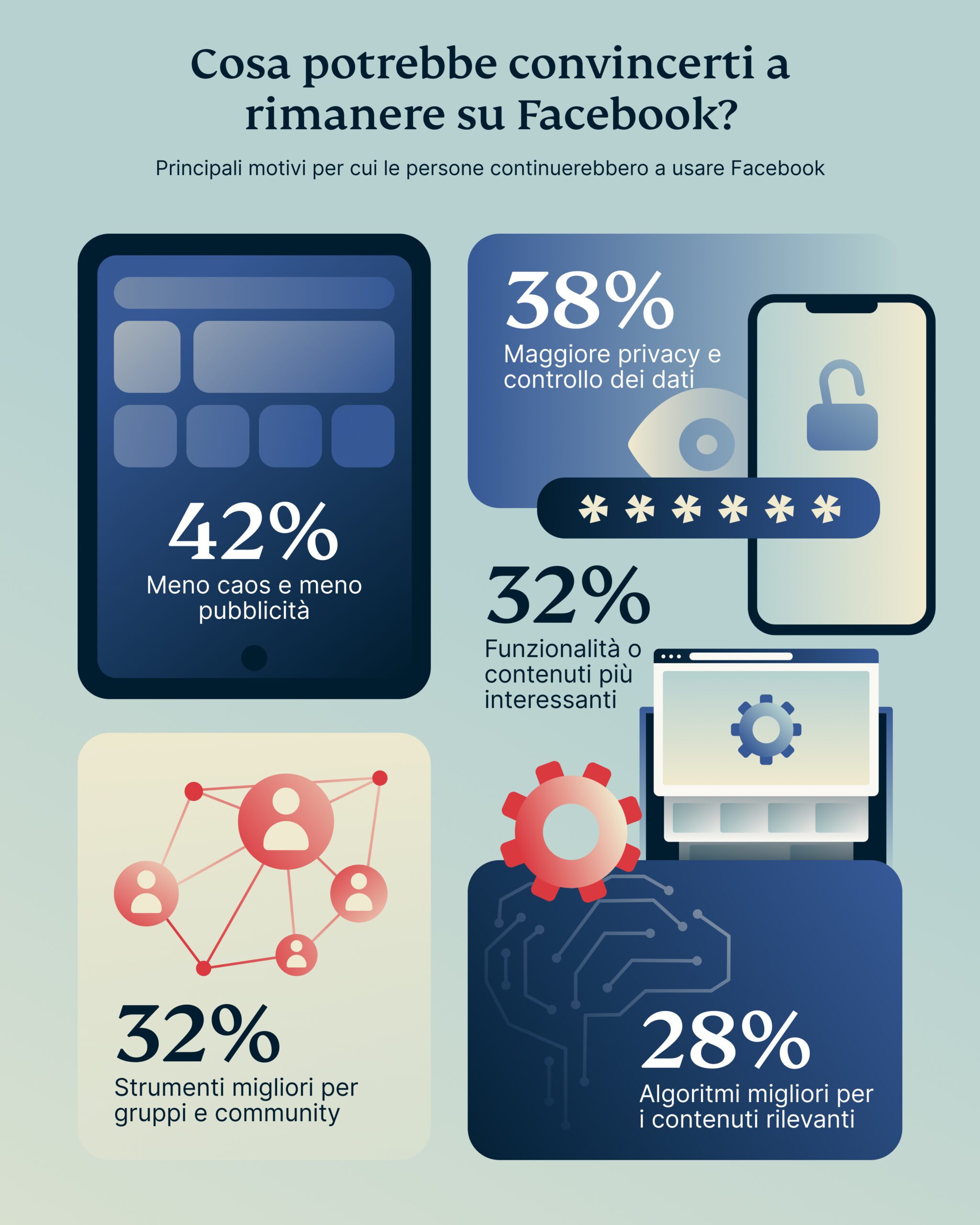 Cosa vogliono davvero gli utenti da Facebook? La risposta è semplice: semplicità, fiducia e rilevanza. In tutte le fasce d’età, gli utenti chiedono meno annunci pubblicitari e più privacy. Vogliono una piattaforma che abbia uno scopo, senza essere appesantita da contenuti irrilevanti o da un’interfaccia caotica.