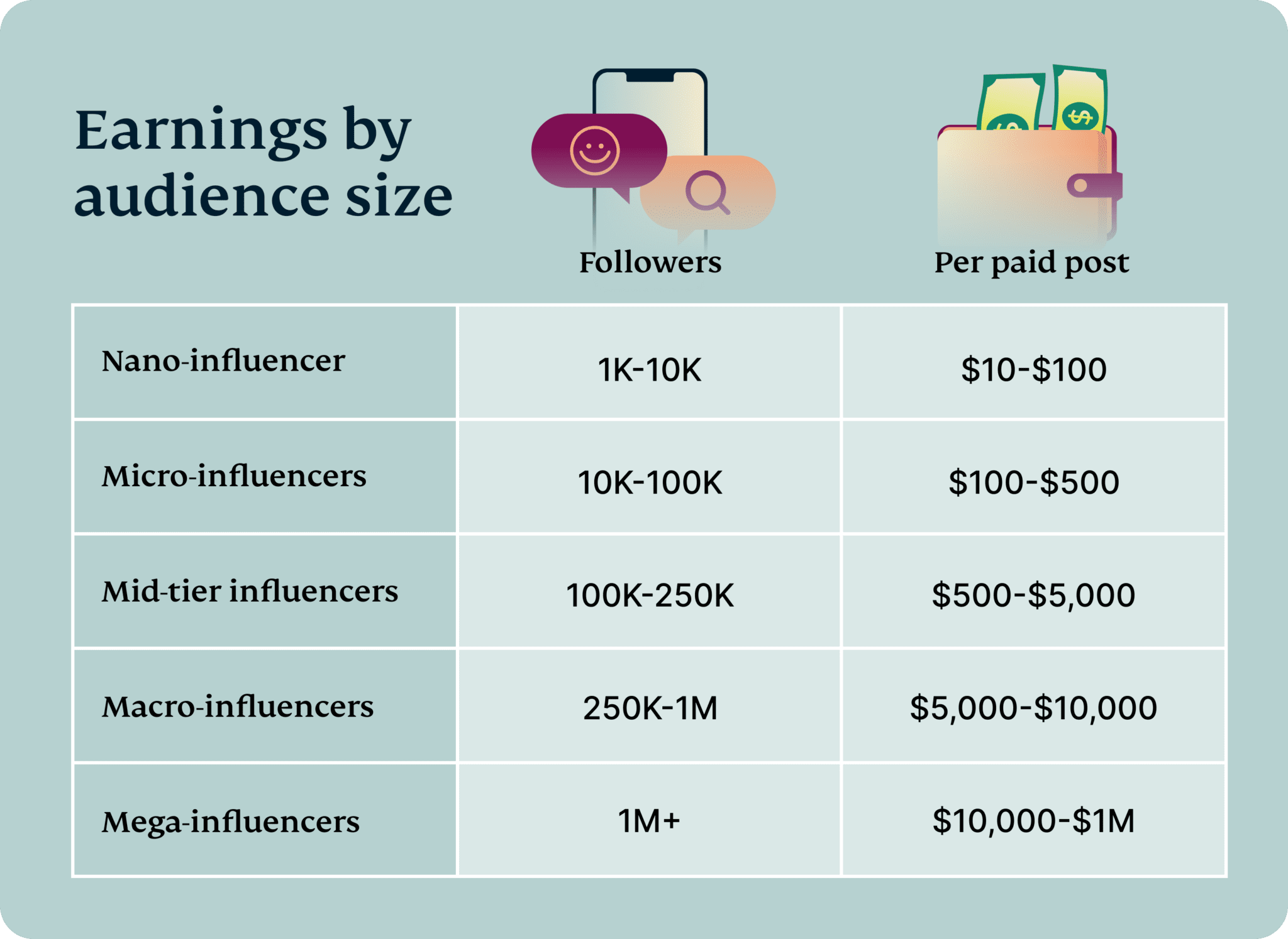 Guadagni degli influencer in base alle dimensioni dell'audience