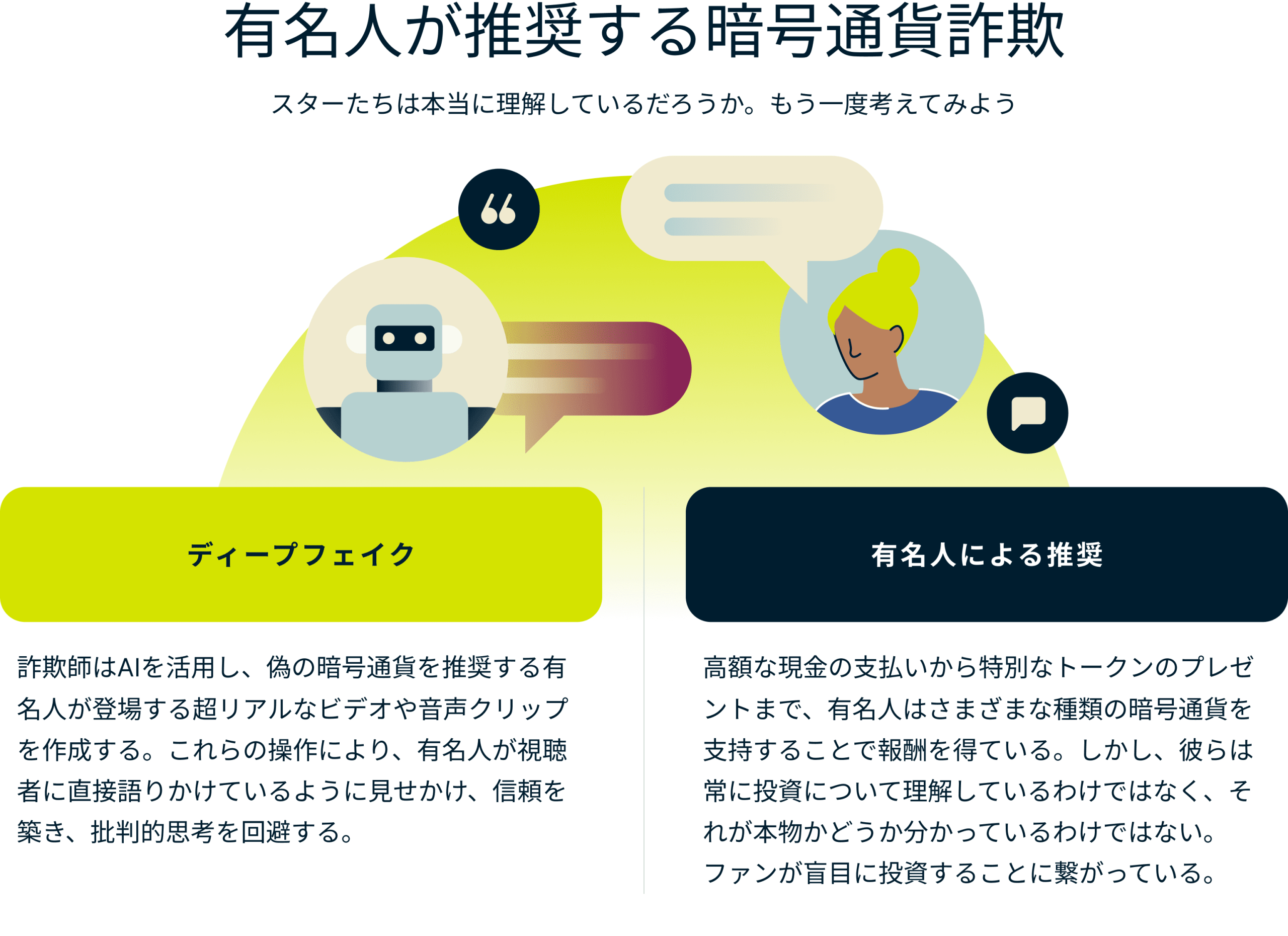 • AIやディープフェイク詐欺:ディープフェイクは、AIを使って動画や音声を本物のように見せかけます。詐欺師は、偽の商品に有名人からの推薦文をつけたり、偽のニュースを作ったりして、あなたを騙そうとすることがあります。これらのAIを搭載したウェブサイトやアプリの中には、個人情報を密かに収集したり、あなたを騙して悪意のあるリンクをクリックさせたりするものがある可能性があります。