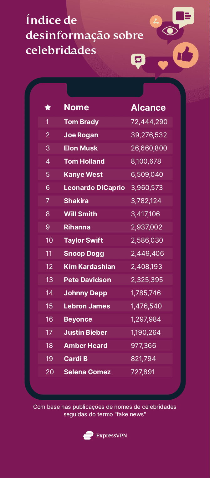 Com celebridades como Beyoncé, Johnny Depp e Kim Kardashian completando o top 15, fica claro que as divas, seus namoros e dólares são os principais impulsionadores das fake news. Vamos dar uma olhada nas estrelas das fake news que tiveram o maior alcance.