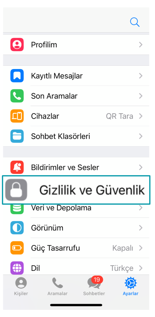 2. Gizlilik ve Güvenlik sekmesine dokunun. Bu bölümde telefon numarası, profil fotoğrafı, son görülme zamanı gibi bilgilerinizi kimlerin görebileceğini kontrol edebilirsiniz. Bu alanları "Herkes" yerine "Kişilerim" olarak ayarlamak, bilgilerinizin daha gizli kalmasını sağlar.
