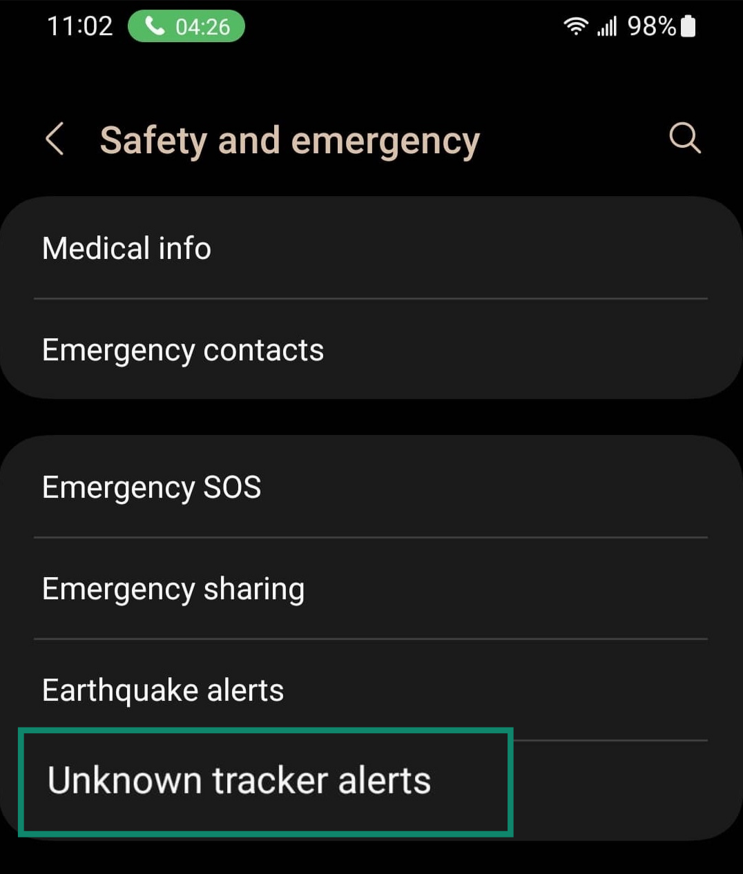 Screenshot of the Safety and emergency settings page on Android with Unknown tracker alerts highlighted.