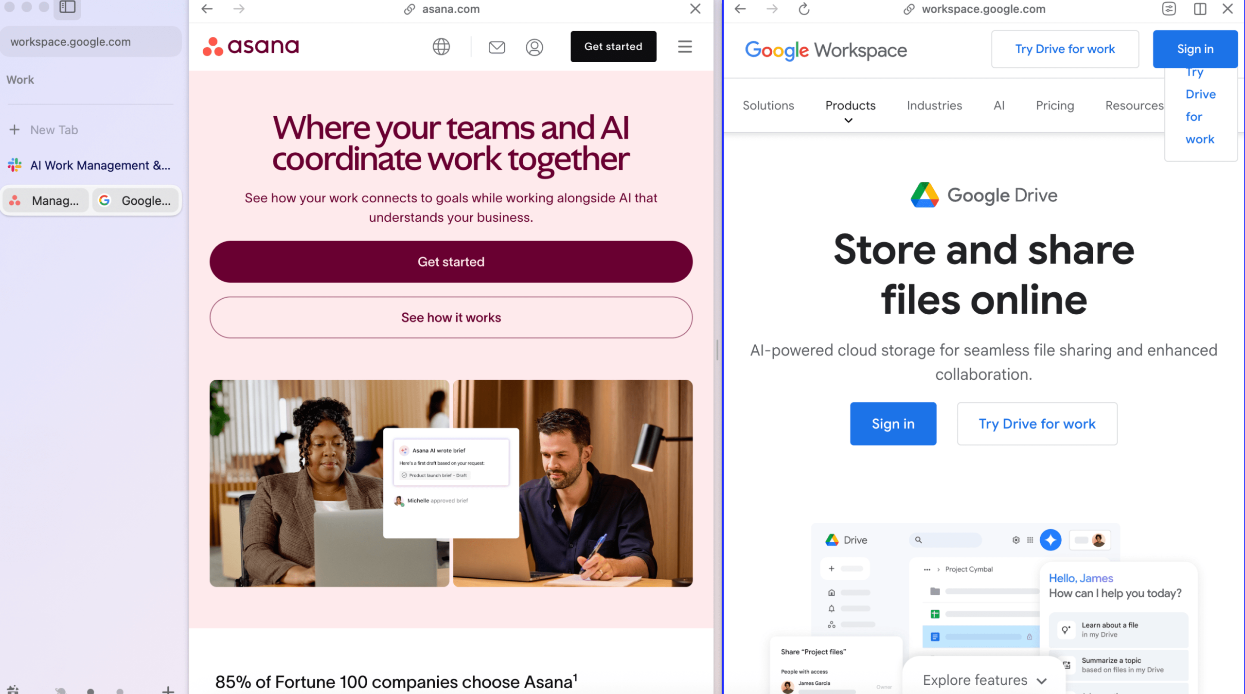 And here’s a Space hosting tabs related to work, containing sites like Asana, Slack, and Google Drive.