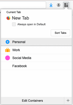 2. Open Firefox and click and hold the + icon to create a new tab. Your suggested container types will appear: Personal, Work, Social Media, and Facebook.