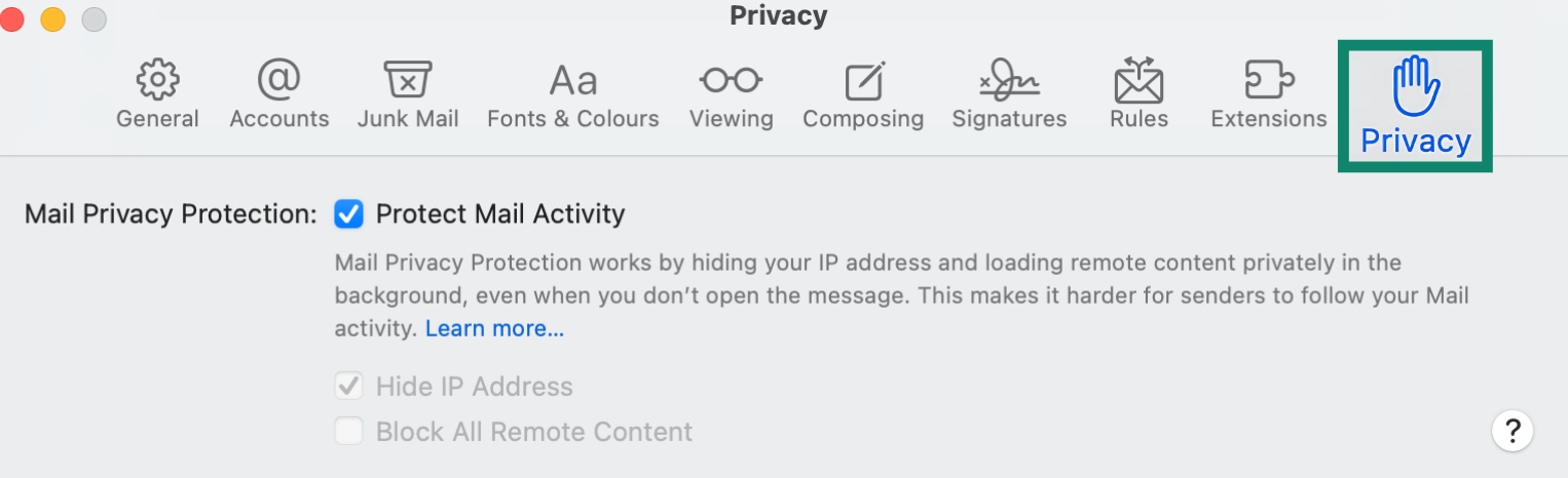 - Uncheck Protect Mail Activity and check Block All Remote Content.