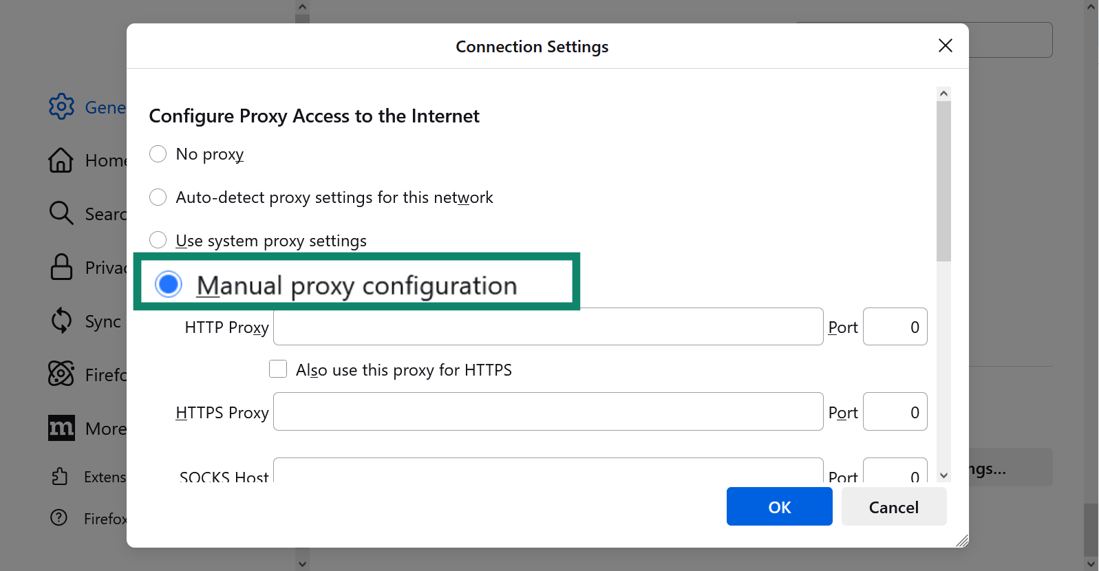 - Choose Manual. Enter the IP address and port number for the SOCKS5 proxy. If required, input your username and password.
