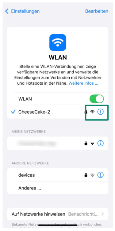 2. Finden Sie das Netzwerk, womit Sie verbunden sind und tippen dann auf das kleine Symbol (i) neben dem Namen Ihres Netzwerks.