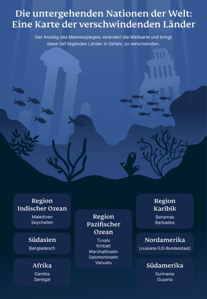 Für viele Küsten- und Inselregionen war der Ozean schon immer eine Quelle des Lebens – er treibt Wirtschaften an, formt Kulturen und verbindet Gemeinschaften. Doch jetzt droht er, alles wegzunehmen. Länder wie Tuvalu, die Malediven und Kiribati gehören zu den am stärksten gefährdeten. Aber sie sind nicht allein. Überall auf der Welt sind tief liegende Gebiete – von Atollen im Pazifik und Indischen Ozean bis zu Teilen von Bangladesch und Louisiana – dem Risiko ausgesetzt, unter den Wellen zu verschwinden.