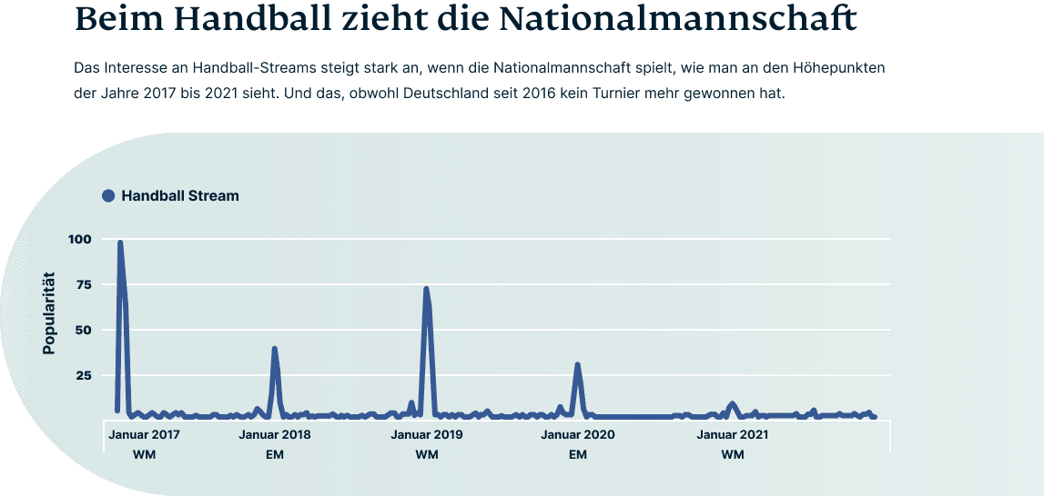 Beim Handball ist es interessant zu sehen, dass das Interesse an Streams immer dann ansteigt, wenn die Nationalmannschaft spielt. Zumindest war dies in den letzten Jahren so: Der Höhepunkt war die WM 2017, während im Zeitraum der WM 2021 nicht viel häufiger nach "Handball Stream" gesucht wurde als sonst. Auch das Handballturnier bei den olympischen Sommerspielen sorgte für keinen besonderen Anstieg.