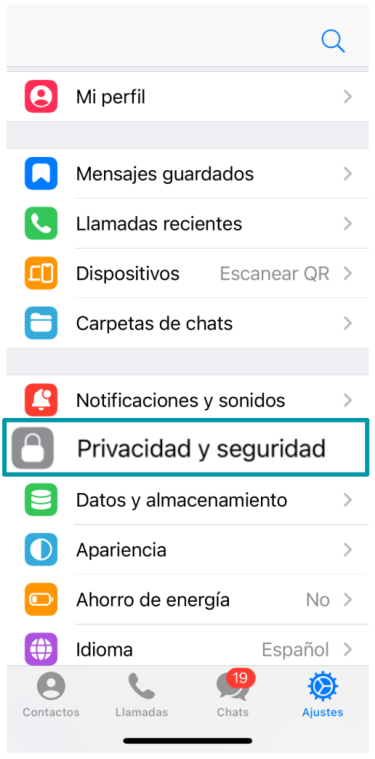 - Pulsa en Privacidad y seguridad. Aquí puedes decidir quién puede ver tu número de teléfono, foto de perfil y estado. Puedes limitar el acceso a Mis contactos en lugar de a Todos para preservar la privacidad de tus datos personales.