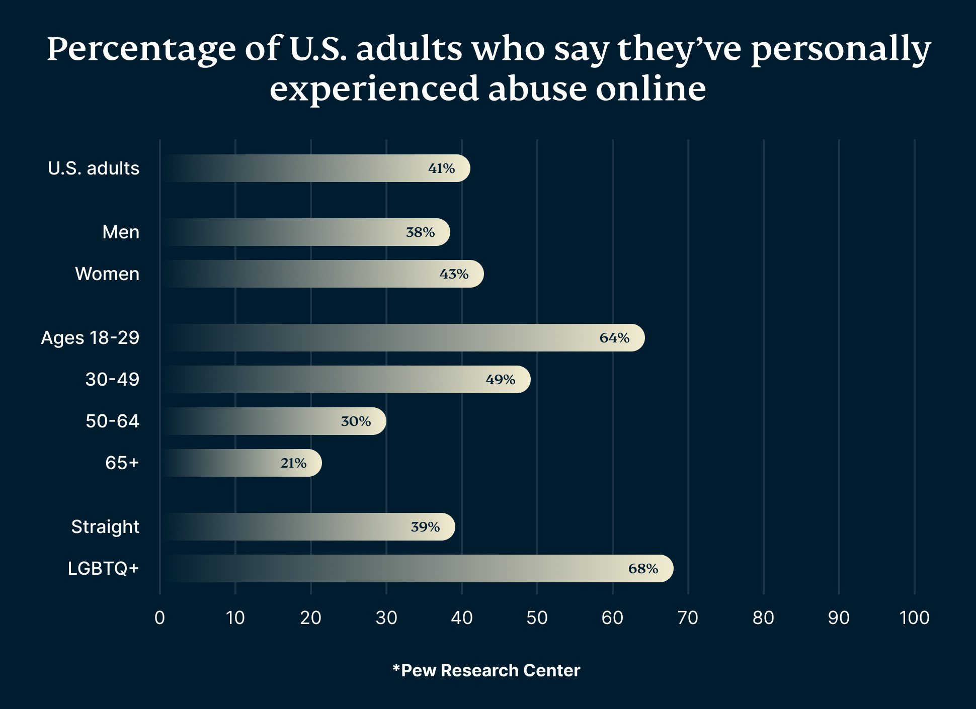 Une étude du Pew Research Center a révélé que jusqu'à 4 utilisateurs d'internet sur 10 aux États-Unis ont été victimes de harcèlement en ligne, allant des incidents moins graves comme les insultes aux formes plus invasives comme la traque. De même, une étude de Statista a révélé que 51 % des Britanniques ont été victimes d'intimidation en ligne, et 36 % ont été victimes de trolls en ligne.