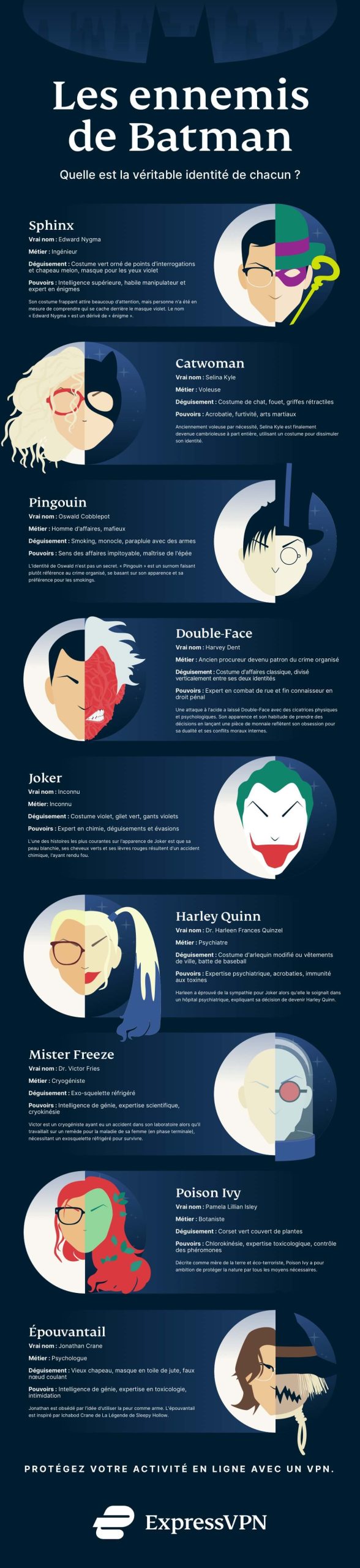 Apprenez-en plus sur les ennemis de Batman grâce à notre graphique couvrant chaque personnage. The Batman, dernier film de la franchise, sera disponible dans les cinémas français le mercredi 2 mars 2022 !