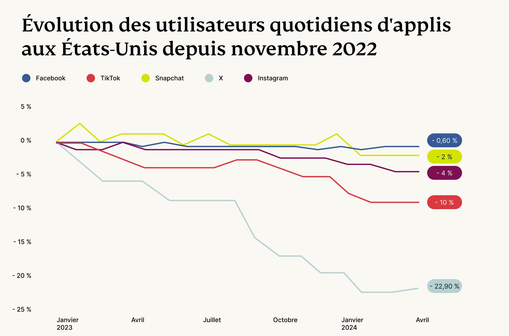 Le parcours de X vers le statut de super application, en particulier sur un marché américain concurrentiel saturé par des géants tels que Facebook, YouTube, Instagram et Snapchat, présente un défi notable marqué par son classement actuel en tant que cinquième plateforme de médias sociaux la plus populaire. La difficulté principale de X est liée à sa base d'utilisateurs en perte de vitesse, un aspect important qui doit être pris en compte si X veut atteindre ses objectifs ambitieux.
