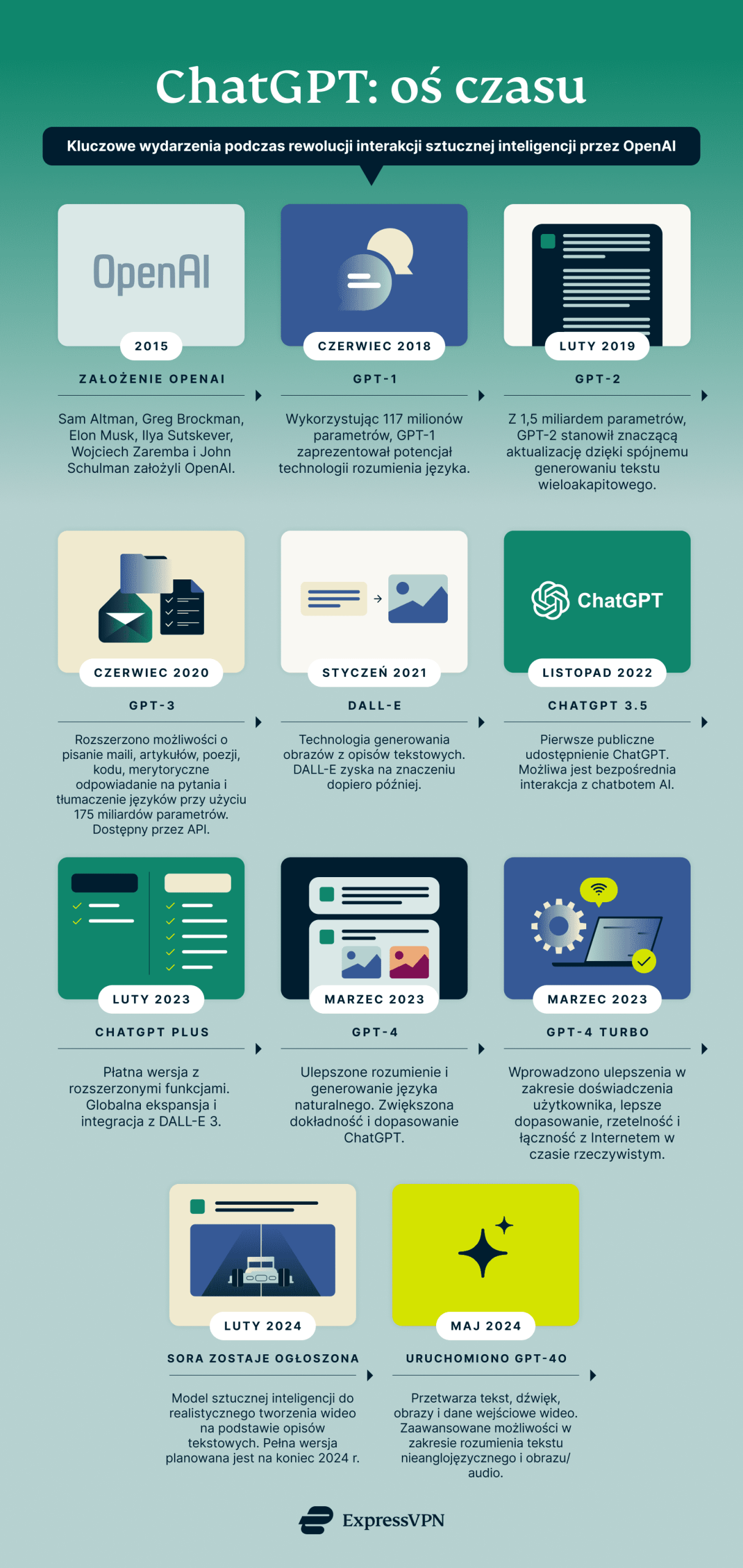 Z biegiem lat, pionierskie działania OpenAI zakończyły się opracowaniem ChatGPT, tym samym zmieniając sposób interakcji społeczeństwa ze sztuczną inteligencją. Oto kluczowe wydarzenia, które kształtowały ewolucję ChatGPT: