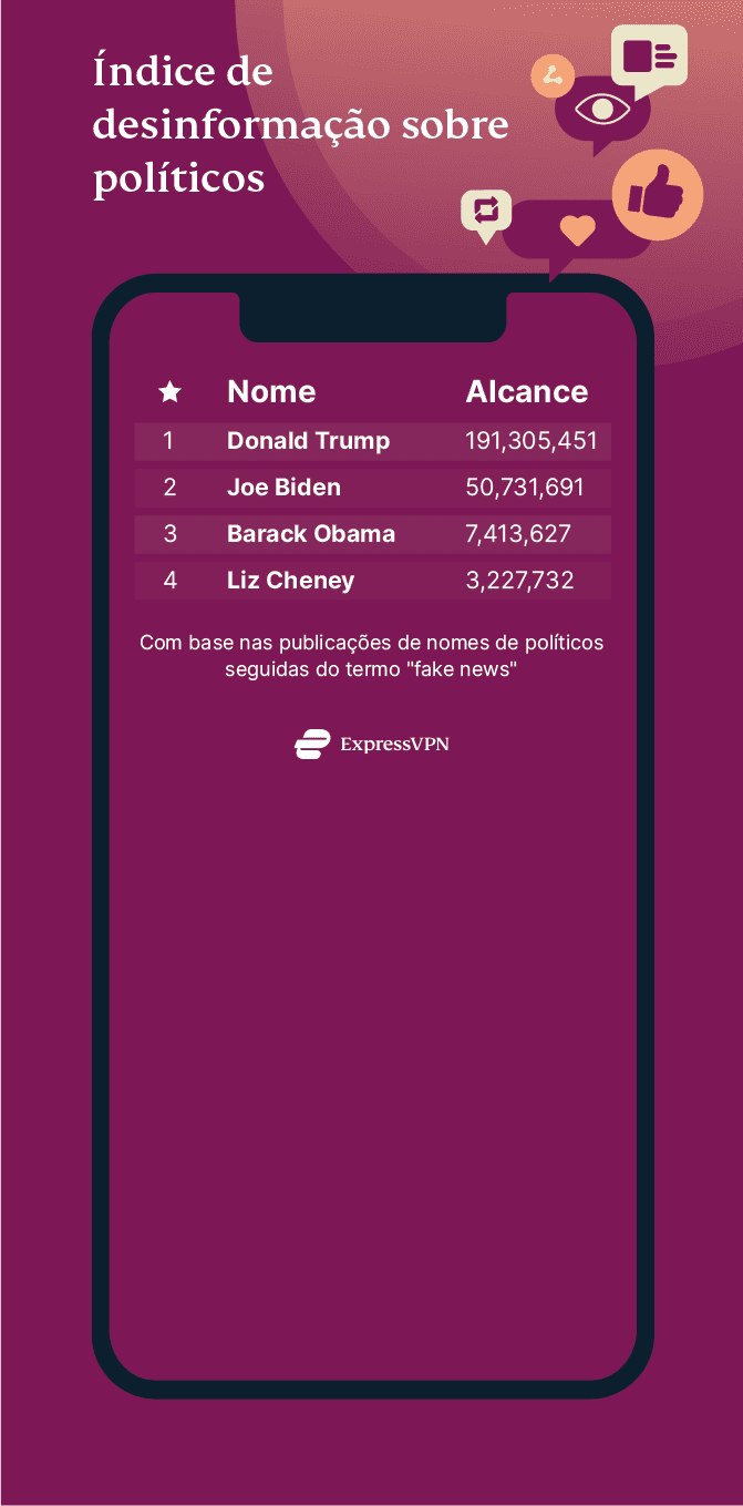 Donald Trump indiscutivelmente popularizou o conceito de fake news durante sua presidência, então não deve ser surpresa que ele esteja no topo da nossa lista de políticos mais associados ao termo. A pesquisa mostra que 191.305.451 pessoas já se depararam com essas postagens relacionadas ao ex-presidente.