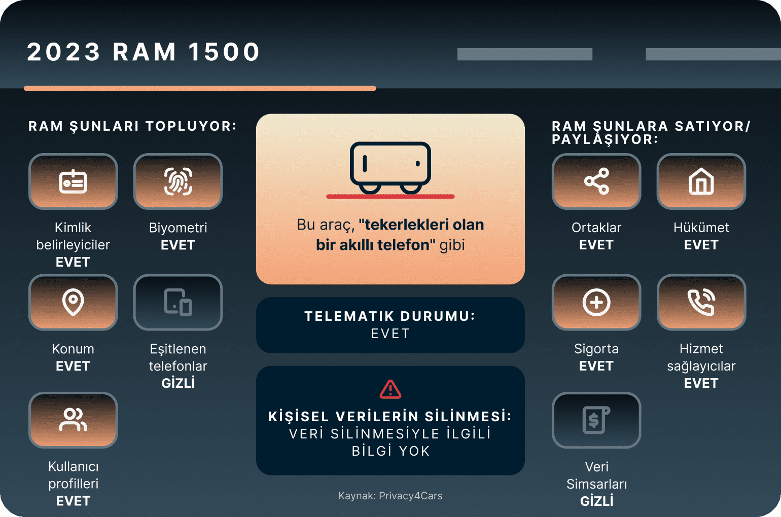 Konu kişisel veriler olduğunda, RAM, isimler ve adreslerden Sosyal Güvenlik numarası ve sürücü belgesi bilgilerinin yanı sıra biyometrik verilere kadar kişisel kimlik belirleyiciler dâhil olmak üzere, “hiç silmeme” politikasını tercih ediyor. RAM ayrıca zaman, hız, hızlanma ve frenleme gibi verileri kaydederek sürücü alışkanlıklarını takip ediyor. Konum, hava durumu ve gidilen rotalar gibi yolculuk bilgilerini de takip ediyor. Hatta yakıt doldurma, pil durumu ve kamera görüntülerini takip ederek gibi kendi durumunu da izliyor.