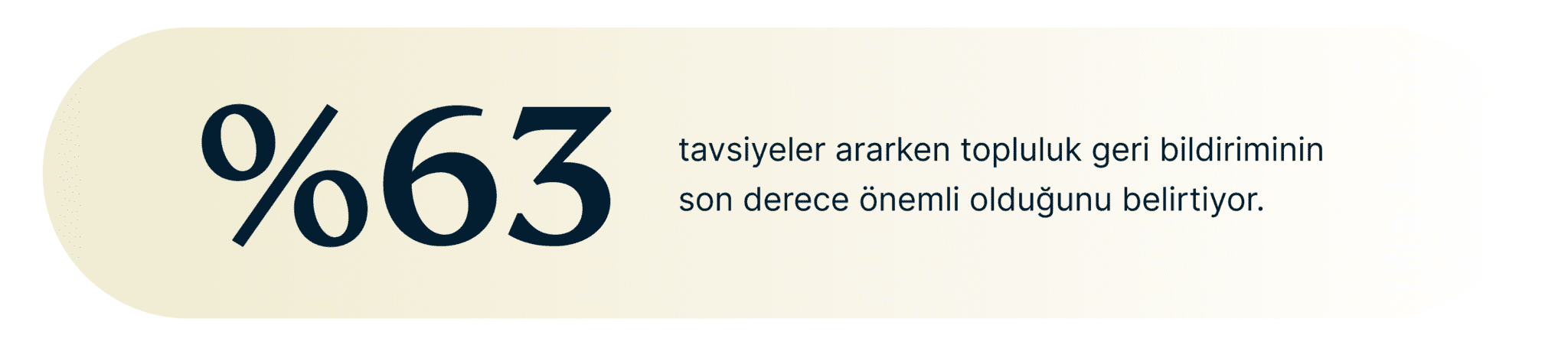 Anketimiz, insanların %63'ünün öneri ararken topluluk geri bildirimlerini önemli veya son derece önemli bulduğunu ortaya koyuyor. Bu durum, kullanıcı tarafından oluşturulan içeriğin gücünü vurguluyor; gerçek yaşam deneyimleri ve içgörüler, yalnızca nesnel bilgilere göre daha fazla ağırlık taşıyor.